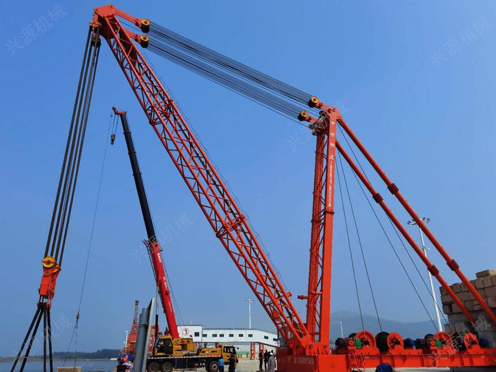 桅桿式起重機桅桿式起重機,固定安裝的起重機,一般用于港口碼頭桅桿式起重機又稱為拔桿或把桿,是最簡單的起重設(shè)備。一般用木材或鋼材制作。這類起重機具有制作簡單、裝拆方便,起重量大,受施工場地限制小的特點。 特別是吊裝大型構(gòu)件而又缺少大型起重機械時,這類起重設(shè)備更顯它的優(yōu)越性。但這類起重機需設(shè)較多的纜風(fēng)繩,移動困難。另外,其起重半徑小,靈活性差。因此,桅桿式起重機一般多用于構(gòu)件較重、吊裝工程比較集中、施工場地狹窄,而又缺乏其它合適的大型起重機械時
