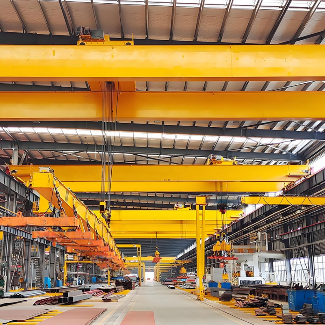 QC 型電磁橋式起重機(jī)是搭載電磁吸盤(pán)的橋式起重設(shè)備,以雙梁橋架為主體結(jié)構(gòu)(主梁與端梁連接成橋式框架),核心配置 “電動(dòng)葫蘆 + 電磁吸盤(pán)” 起升單元;通過(guò)端梁沿廠房軌道的縱向運(yùn)行、小車(chē)沿主梁翼緣的橫向移動(dòng),結(jié)合電磁吸盤(pán)的 “勵(lì)磁吸附 / 退磁釋放” 動(dòng)作,實(shí)現(xiàn)導(dǎo)磁性金屬物料(廢鋼、鐵錠、鋼坯等)的無(wú)捆扎快速吊運(yùn)。因其適配散料 / 工件的高效裝卸需求,已成為廢品回收、鋼鐵加工、機(jī)械制造車(chē)間的常用起重設(shè)備。